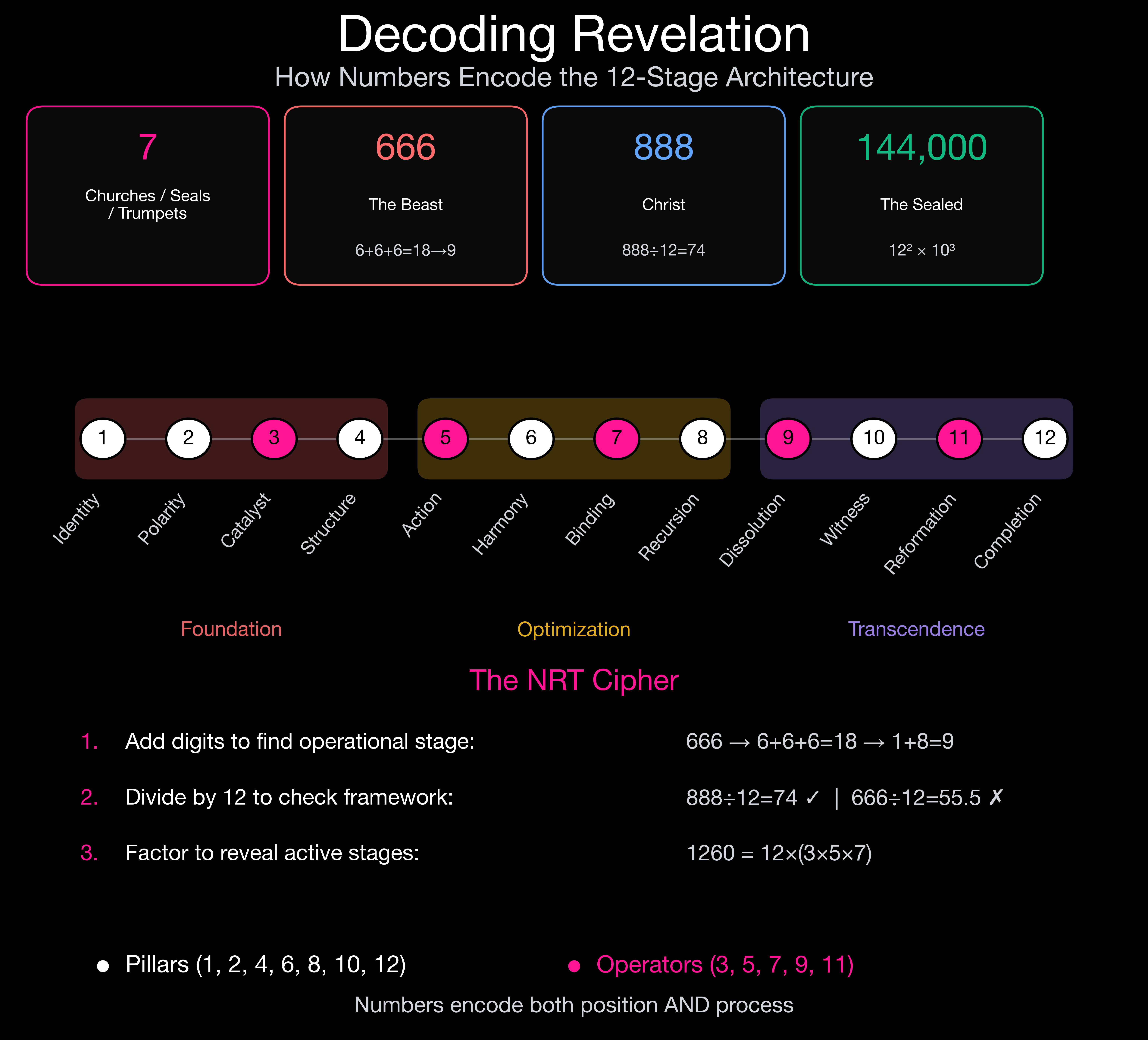 Example: 888 = 12 × (2 × 37) : Check: 888 ÷ 12 = 74 ✓ (Framework present!) : Isolate 12 (the architecture) : Operational: 2 × 37 = 2 (Polarity) × 10 (Witness) : What this means: The Two Witnesses (Stage 2 and Stage 10) are operating WITHIN the complete 12-stage framework. You can activate and use both capacities consciously.